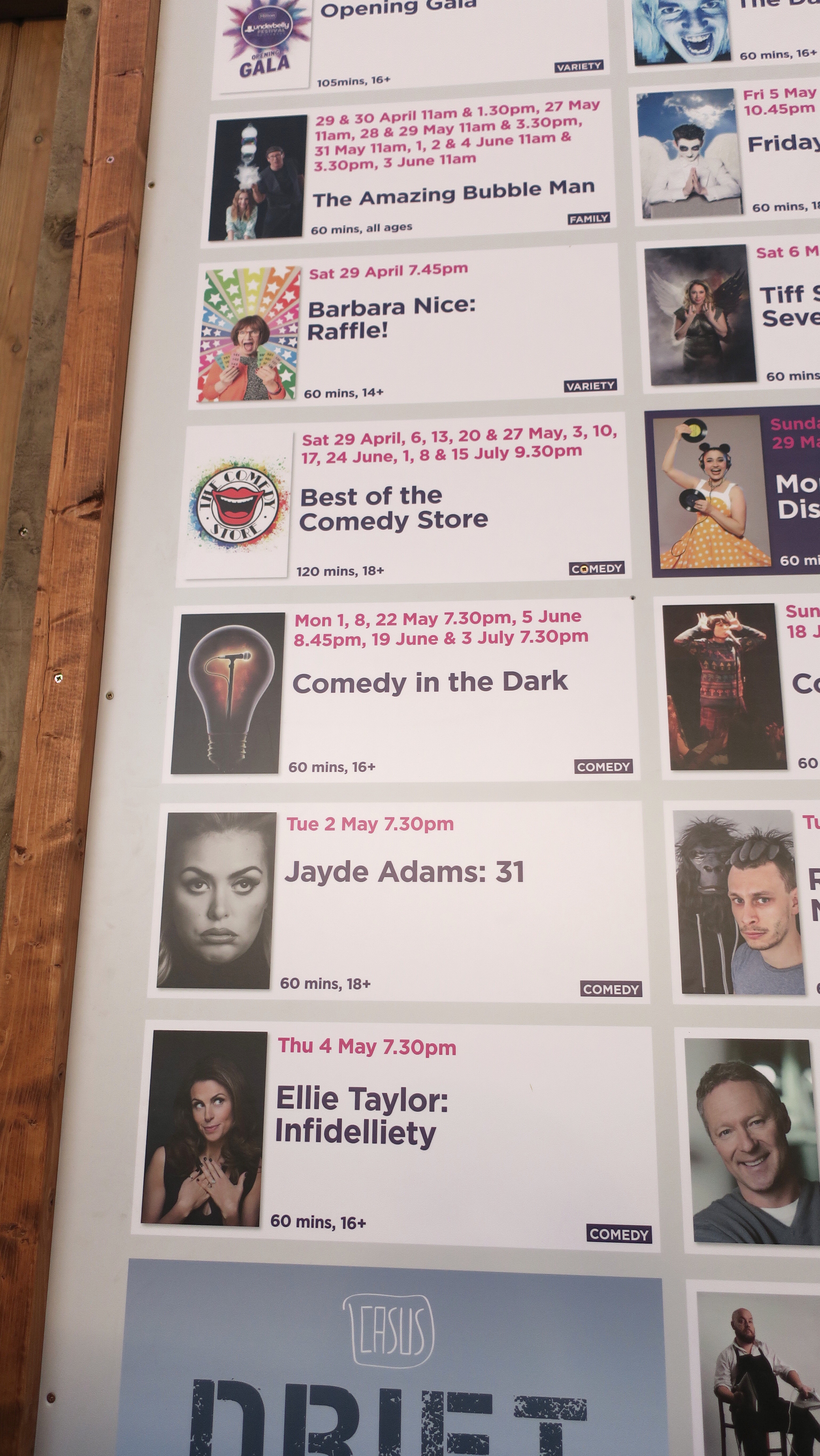 When I walked into the main area, which is essentially a large outdoor patio, I was amazed at the diverse drink and food selections. So naturally I had to try these food options in front of me 😉 I bought a nice cold cup of Thatchers cider (my favourite cider brand from the UK!) and also some yummy chips (or fries as we North Americans say haha). At first, I thought this was an outdoor evening food market, but then realized people were lining up to watch performances that were about to start at 7pm. This event was actually an ongoing festival that goes throughout summer until the end of September. The Underbelly festival has performances ranging from comedy, circus, cabaret and family entertainment. I ended up buying a last minute ticket to the ‘Comedy in the Dark‘ show. I then spent the next hour in pitch black darkness laughing nonstop, it was an amazing comedy show and different + unique experience for sure!